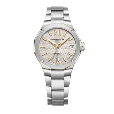 A Baume & Mercier lança em 2023 novas opções de mostrador na oferta Riviera de 33 mm e 36 mm. O primeiro, um mostrador em ouro acetinado, apresenta índices e ponteiros dourados e uma luneta de 12 lados com quatro diamantes de lapidação brilhante engastados. A variante em aço apresenta um anel central em aço PVD revestido a ouro 5N.