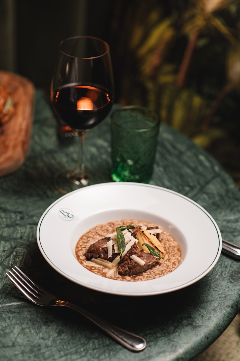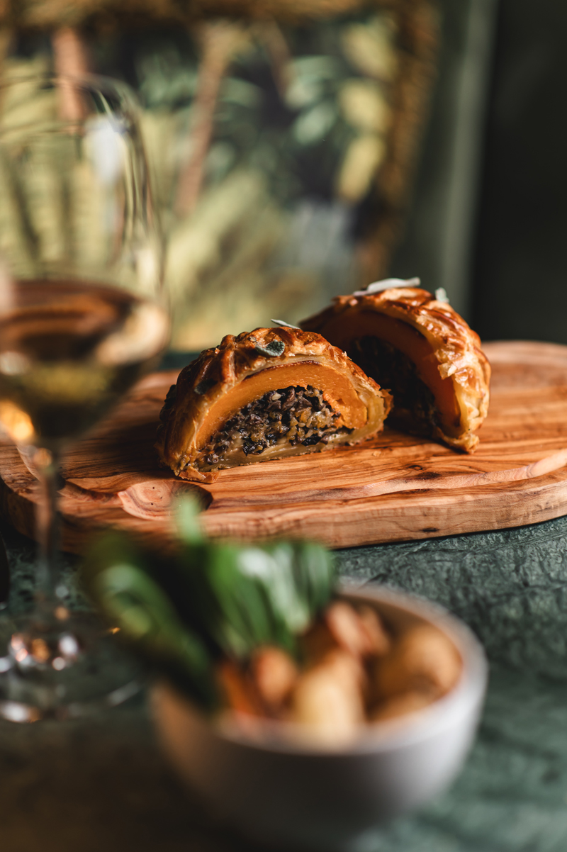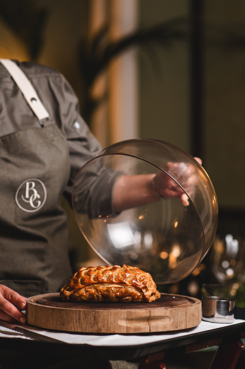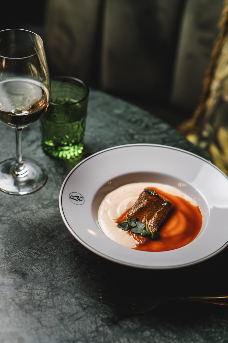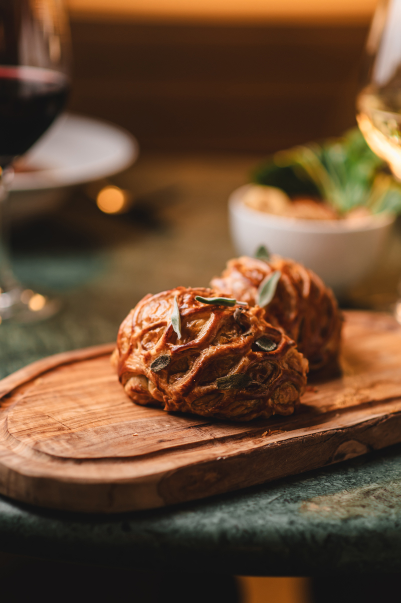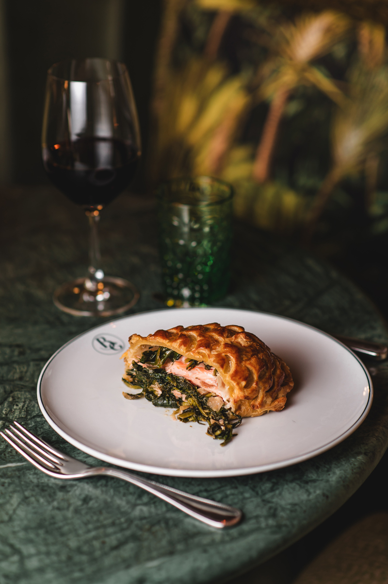 Situado no coração da vila, este espaço é um lugar de rara beleza. De um lado a arquitectura da casa centenária, do outro o luxuriante jardim que lhe dá nome. O segundo momento da noite acontece com o Lombo de bacalhau, broa, tapenade de azeitona, coentros e molho pil-pil. Vem acompanhado pelo Vallado Field Blend 2021. O vinho é produzido a partir de vinhas velhas, com cerca de 90 anos. “São vinhas pouco produtivas em termos de quantidade, mas que fazem vinhos de alta qualidade”, explica Francisco Ferreira. Assim nasce um vinho redondo, de grande equilíbrio. “É um vinho versátil que tanto funciona no Inverno como no Verão”, explica o enólogo do Vallado.