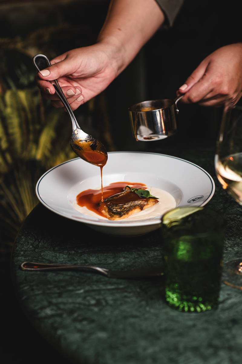 É esta justa homenagem que o enólogo lhe faz quando apresenta o primeiro vinho do repasto: o Vallado Reserva 2023. “Um vinho elegante, estruturado e fresco”. Um vinho que casa na perfeição com o primeiro prato da noite: Lírio curado, pickles de rábano, mostarda e leite de tigre. “O leite de tigre é feito por nós”, revela a chef Diana Roque. Aliás, a expressão “feito por nós” será repetida muitas vezes ao longo da noite, o que só dará boas notas ao Bougain Restaurant & Garden Bar em Cascais.