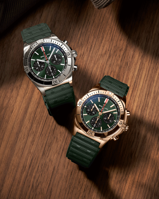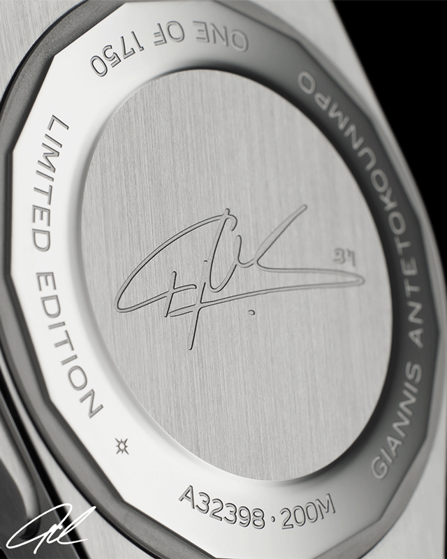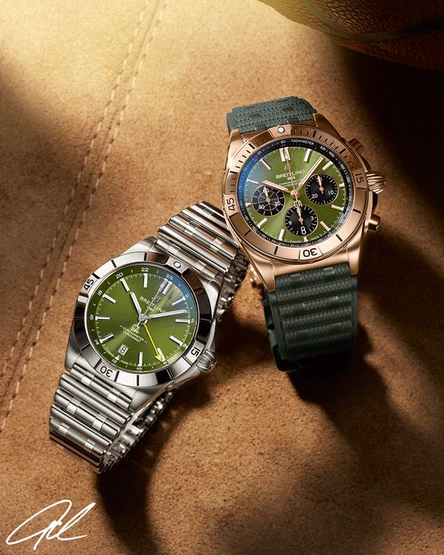 Os relógios apresentam as iniciais “GA” no ponteiro central, um emblema de basquetebol no contador do cronógrafo e a assinatura de Antetokounmpo no fundo de caixa do GMT, enquanto o cronógrafo oferece uma visão sobre o movimento de manufatura Calibre Breitling 01 e do seu rotor em ouro. A cor verde do mostrador faz alusão à camisola dos Milwaukee Bucks, equipa onde Giannis conquistou o seu lugar na história do basquetebol. Cada exemplar é acompanhado por uma embalagem especial e uma mensagem pessoal do próprio atleta. Ambos os relógios são edições limitadas, sendo 1750 exemplares da versão GMT e 250 exemplares da versão cronógrafo.
