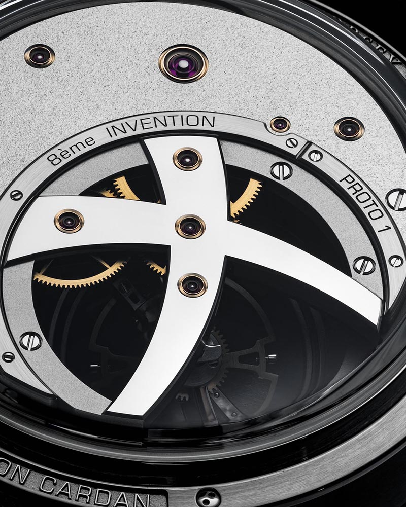 Manual winding with patented Cardan tourbillon, ultra-fast 30º titanium tourbillon cage with gold counterweight, four coaxial barrels, 21,600 vph, 80-hour power reserve.