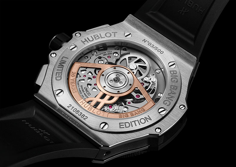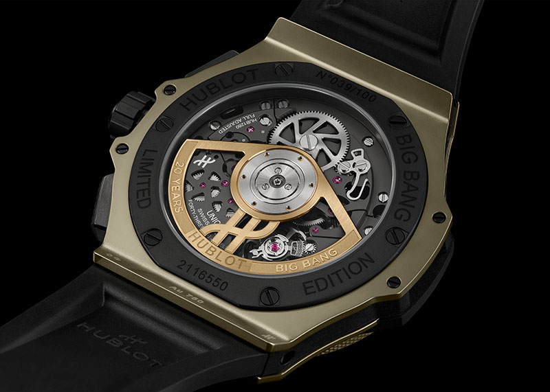 Automatic, manufacture calibre MHUB1280 Unico 20 Years, flyback chronograph, column wheel, 354 components, 43 jewels, 28,800 vph, 72-hour power reserve, commemorative rotor engraved “20 Years Hublot Big Bang”.