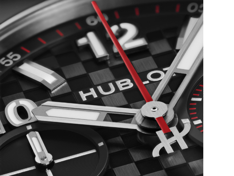 O mostrador exibe um padrão de efeito carbono, evocando os primeiros traços gráficos da linha. As variantes distinguem-se por materiais emblemáticos da marca: