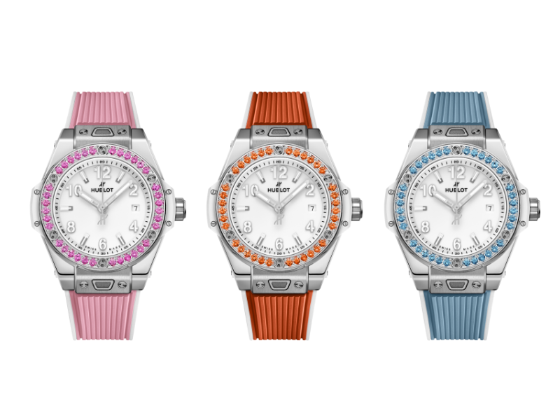 A linha Big Bang One Click Joyful traz um sopro de frescura à colecção feminina da marca. Cada peça de 33 mm combina uma luneta engastada com pedras preciosas — de espinelas vermelhas a topázios azuis — com um mostrador lacado branco e uma correia colorida com inserção em borracha a condizer.
