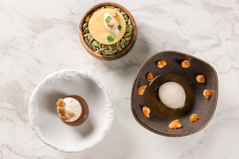 Outros pratos constroem a narrativa com o mesmo equilíbrio entre território e savoir-faire: sapateira de Vila do Conde com yuzu e mostarda Savora, peixe-galo de Peniche com alcachofra e capuchinha, borrego merino alentejano com espargos brancos. Cada um é uma paragem no mapa. E cada garfada, uma conversa com o país.