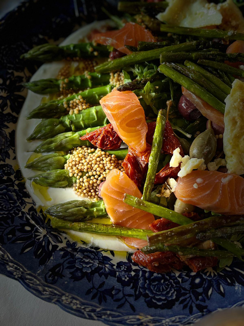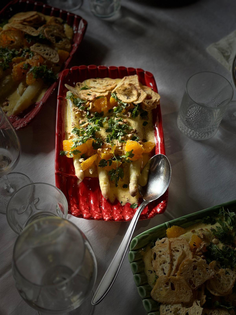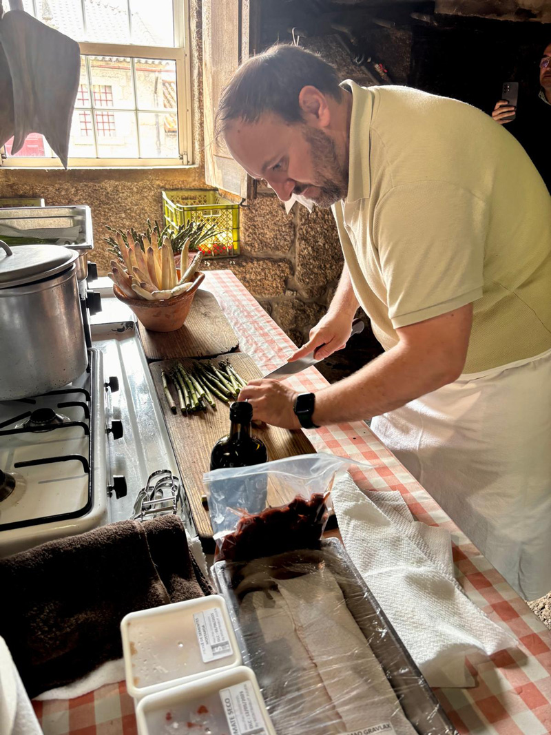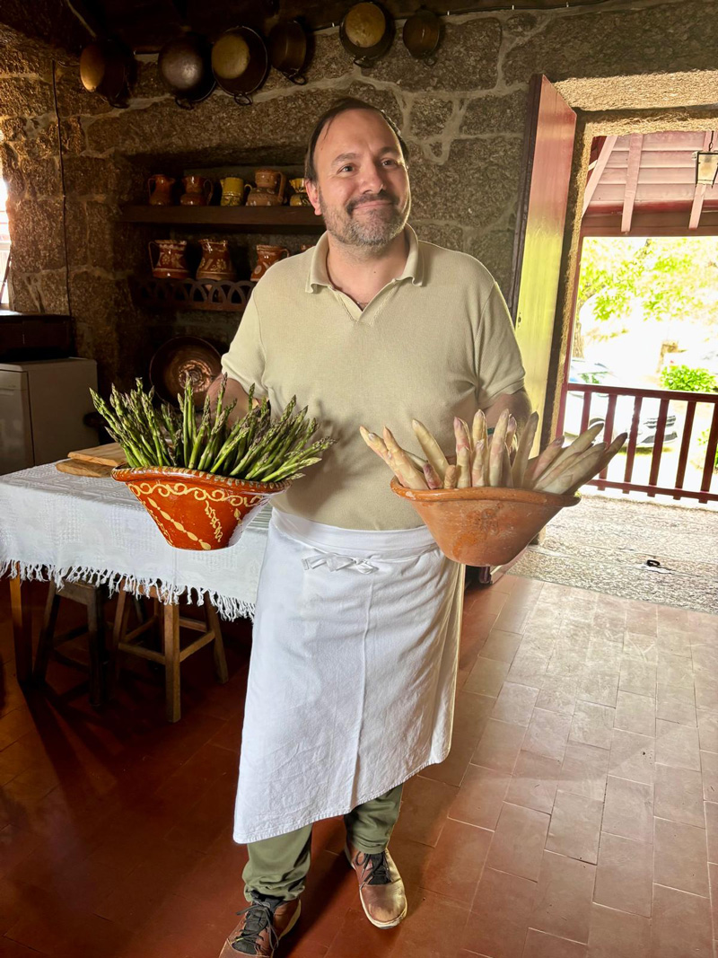 Na velha cozinha de campo, entre louça antiga e garrafas de vinho da região dos Vinhos Verdes, Julien assumiu o comando dos tachos com a mesma precisão com que lidera o passe no Le Monument. Cozinhou espargos brancos e verdes, os mesmos que tínhamos visto nascer naquela manhã. Assados ao sal, preparados com butarga, acompanhados por creme de amêndoa e emulsão de poejo. Entre tábuas de queijos locais, enchidos e conversas soltas, revelou-se algo mais íntimo do que um almoço entre conhecidos: uma comunhão de valores.