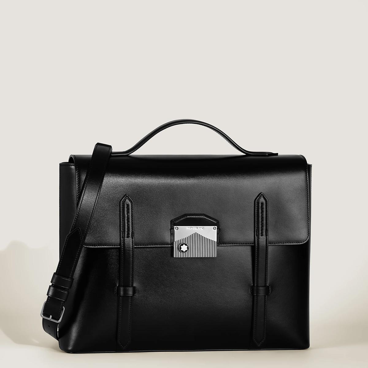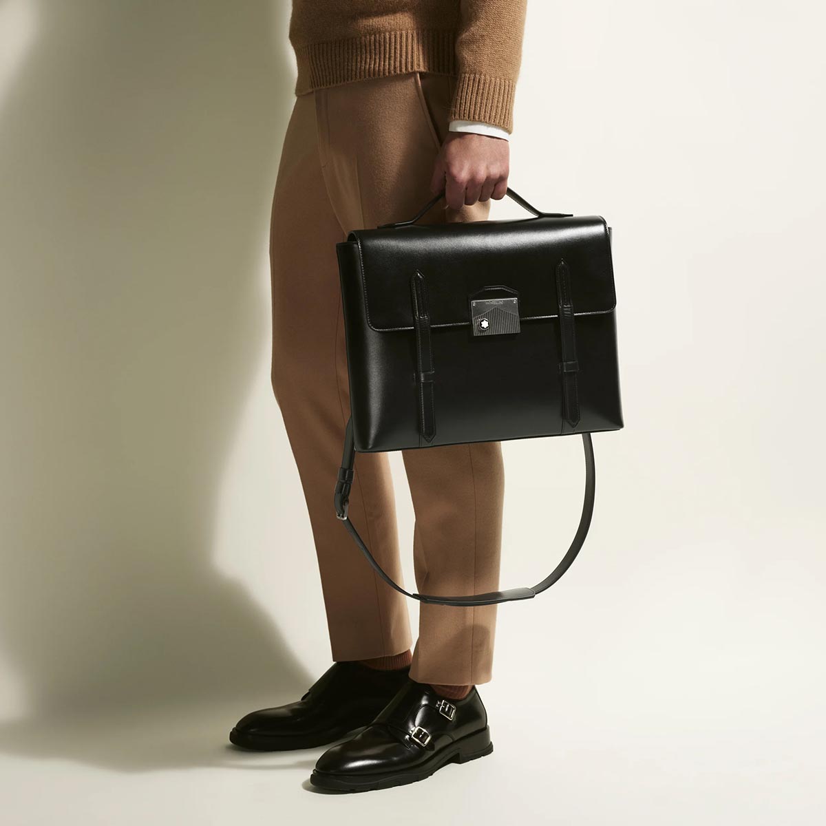 The Meisterstück Briefcase in glossy black leather reflects the nib of the pen in every detail, from the stitching to the zip pulls and handles. The vintage-inspired palladium zip is complemented by a prominent logo for a touch of sophistication. With a top handle, detachable shoulder strap and multiple compartments, this piece is ideal for those looking for elegance without compromising on functionality.