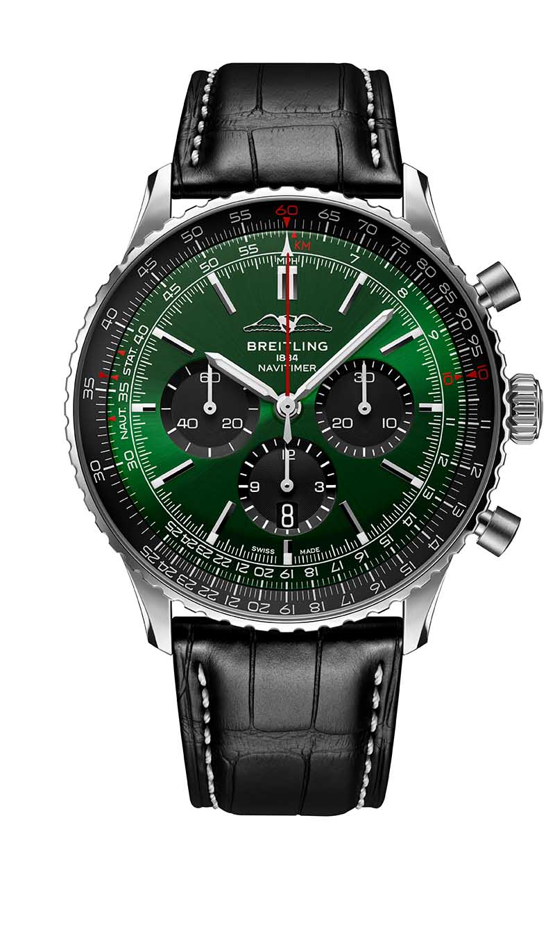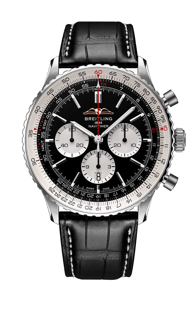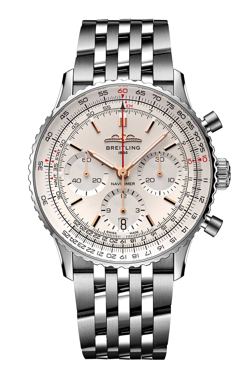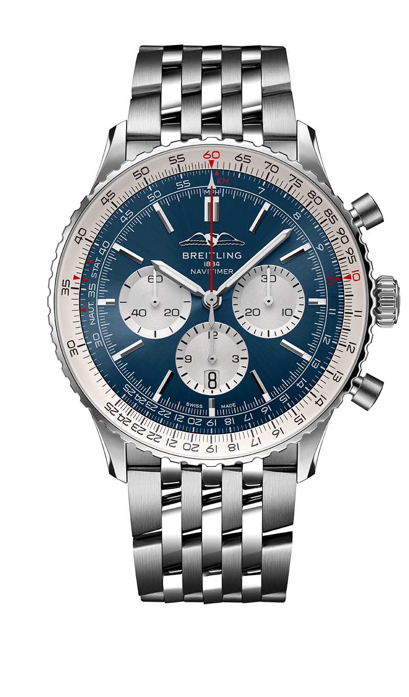 Um olhar mais atento revela os detalhes de modernidade dos novos modelos. Uma régua de cálculo plana e um vidro de safira abobadado criam a ilusão de um perfil mais compacto. A alternância entre acabamentos polidos e escovados confere aos elementos metálicos uma qualidade brilhante, mas discreta. Uma silhueta mais fina da massa oscilante melhora a visão sobre o calibre de manufactura Breitling 01 com certificação COSC, visível através do fundo transparente da caixa. O novo Breitling Navitimer está disponível em vários tamanhos (46 mm, 43 mm ou 41 mm), dois materiais de caixa (aço ou ouro vermelho), várias cores de mostrador e numa panóplia de pulseiras.