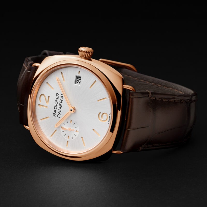 A contemporânea interpretação do Radiomir, o Radiomir Quaranta, surge agora no material Panerai Goldtech™. Assim, o Radiomir Quaranta Goldtech™ é apresentado numa caixa Goldtech™ polida, combinada com um mostrador branco escovado e uma correia em pele de crocodilo castanho mate.