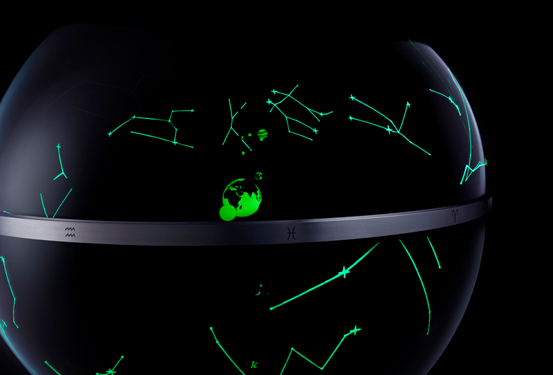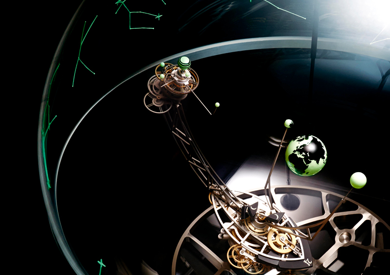 Inspirado pelas observações de 1610 das luas de Júpiter — Io, Europa, Ganimedes e Calisto — o Jupiterium coloca a Terra no centro de uma esfera celeste em rotação, representando de forma precisa o movimento retrógrado dos corpos celestes. Esta complexa coreografia cósmica é alimentada por oito tambores de corda, com uma impressionante reserva de marcha de 40 dias, impulsionando um calendário perpétuo que dispensa ajustes até 2099.
