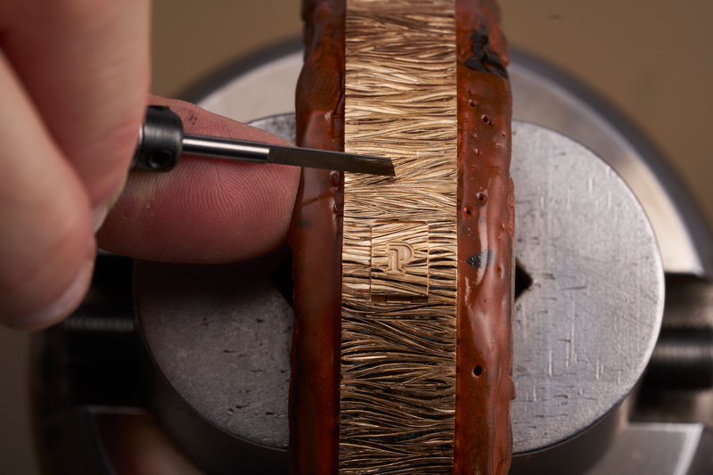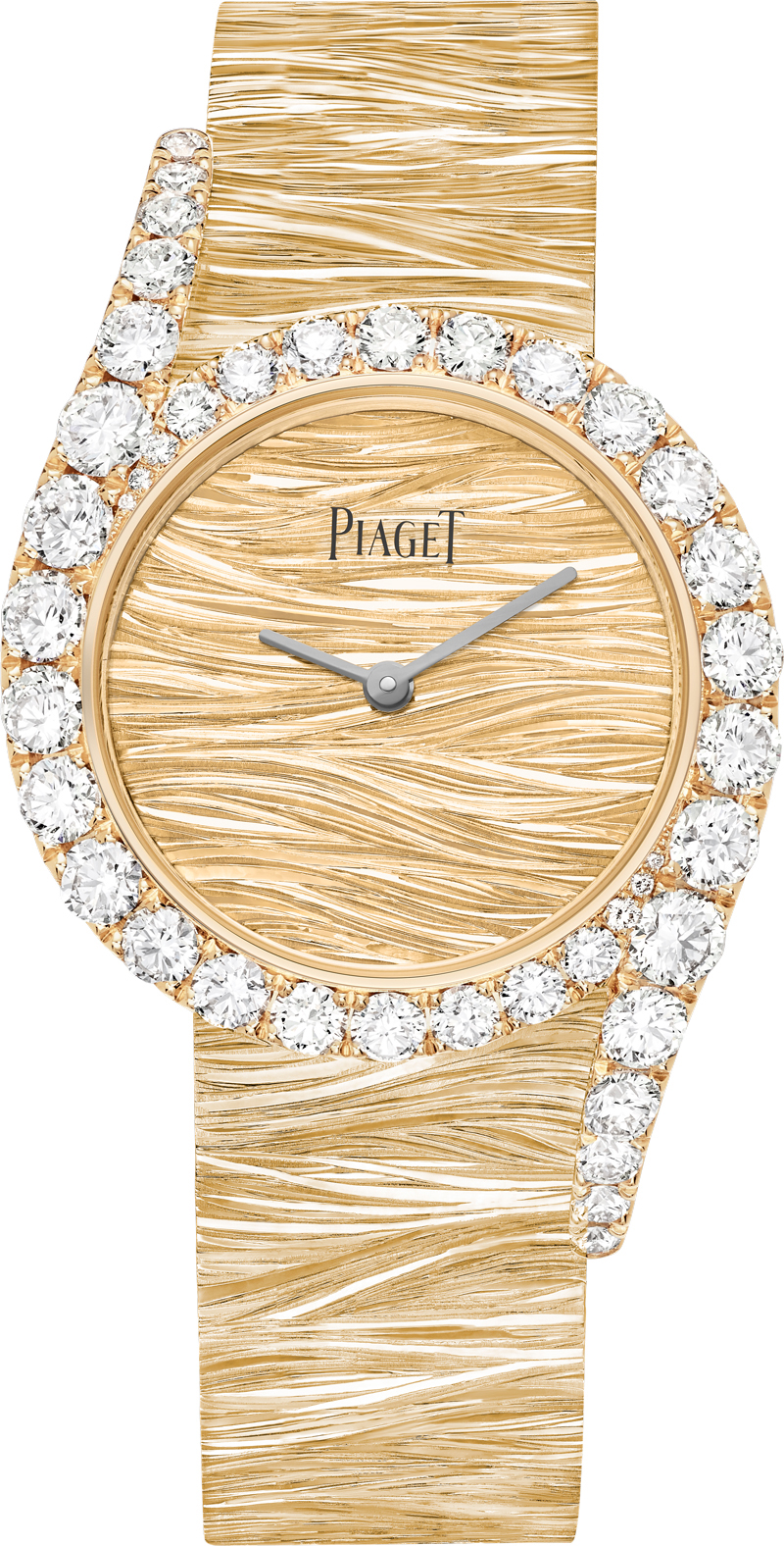 A primeira versão destaca-se pela sua pureza: uma caixa e bracelete totalmente gravadas à mão com um novo padrão ondulado, que evoca o movimento fluido da seda e remete para a elegância dos vestidos de gala. Este acabamento, fruto de dois dias de trabalho minucioso por um único mestre gravador, é enquadrado por 42 diamantes brancos de corte brilhante (4,74 cts) que acentuam o brilho do ouro.