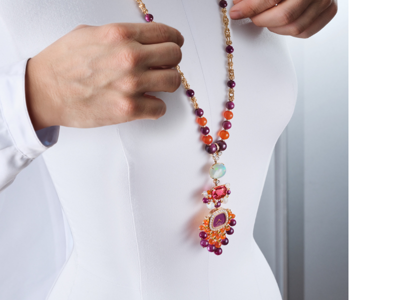 Entre os modelos mais surpreendentes destacam-se um sautoir com mostrador amovível em turquesa, safira amarela do Sri Lanka (29,24 ct) e uma água-marinha (6,11 ct); e as braceletes assimétricas Hidden Treasures Cuffs com opalas, esmalte verde e padrões serpente, em ouro branco ou rosa.