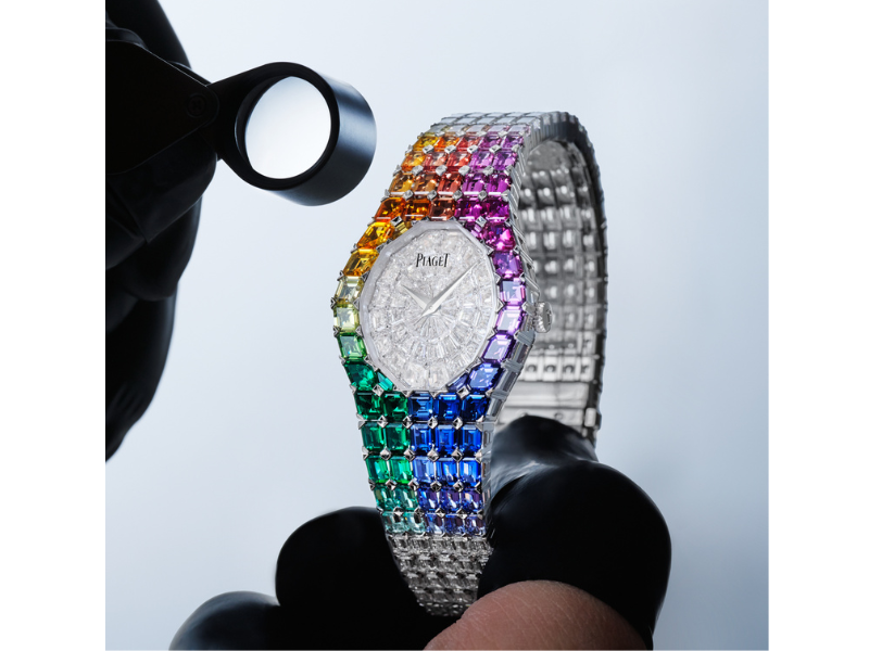 A Piaget dá nova vida a um desenho de 1989 com o Rainbow Aura, peça de Alta Joalharia cujo engaste quase invisível permite uma transição cromática fluida entre gemas preciosamente calibradas. Um verdadeiro arco-íris lapidado, que evidencia a mestria incomparável da Maison na arte da cor e da cravação — um savoir-faire que transcende gerações.