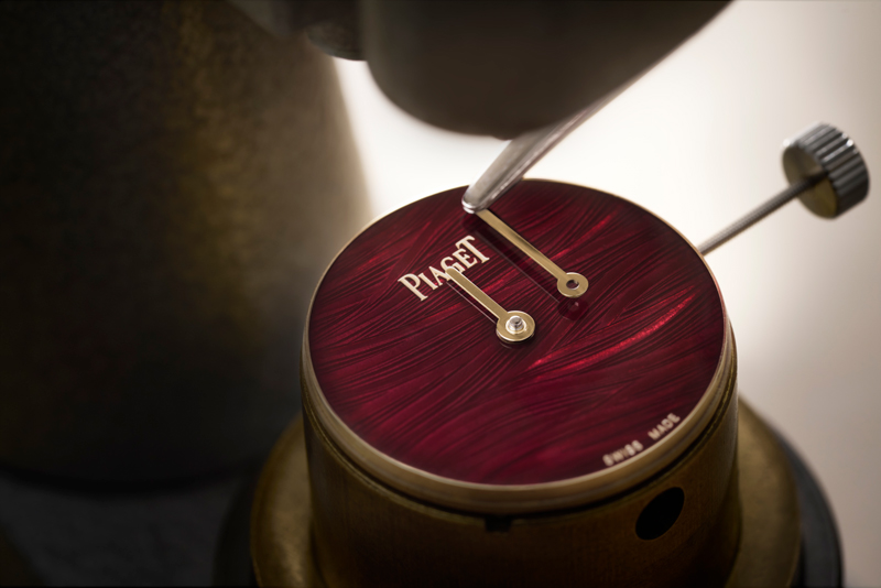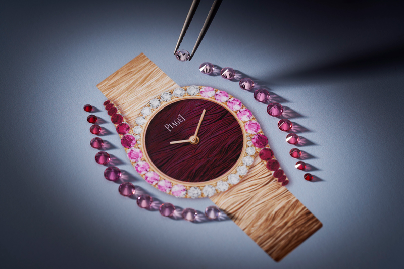 A segunda versão, Limelight Gala Mesmerizing Burgundy, é uma ode à mestria cromática da Piaget. Após o mesmo processo de gravação, o mostrador é coberto com esmalte Grand Feu em tom bordeaux translúcido, revelando uma textura rica e luminosa. A peça é depois engastada com um degradé de gemas que vai dos diamantes e safiras rosa pálido até aos rubis de tonalidade profunda — uma verdadeira sinfonia cromática inspirada nas pedras preciosas vintage e na opulência das festas da Piaget Society nos anos 70.