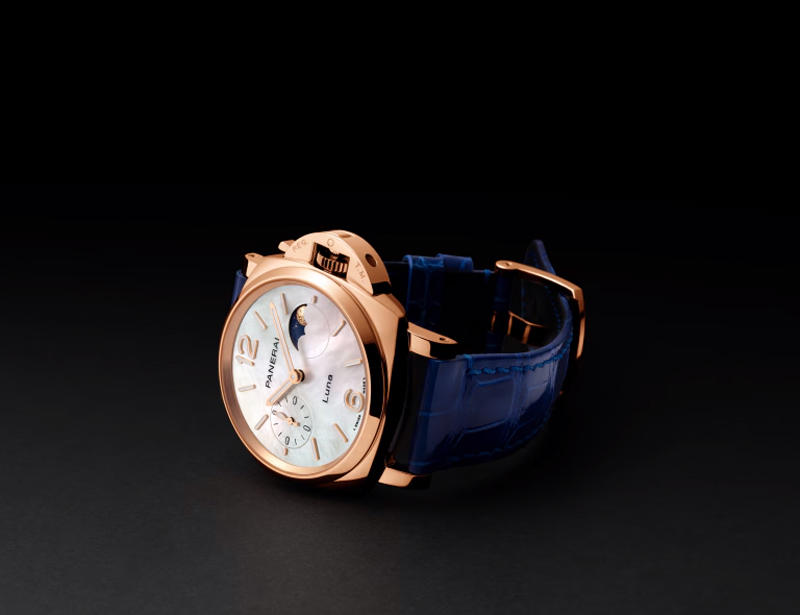 Com uma caixa em Goldtech™ de 38mm e um requintado mostrador em madrepérola, este modelo Panerai oferece uma estética sofisticada e um toque poético com a complicação de fases da lua.