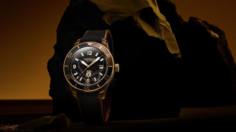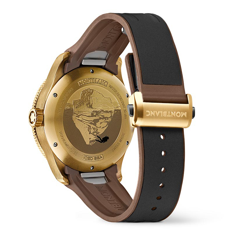 Inspirado nos glaciares, este relógio com mostrador texturizado e luneta rotativa unidireccional em cerâmica é ideal para aventureiros e apreciadores de peças com um design distinto.