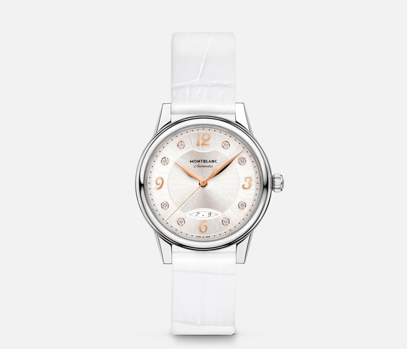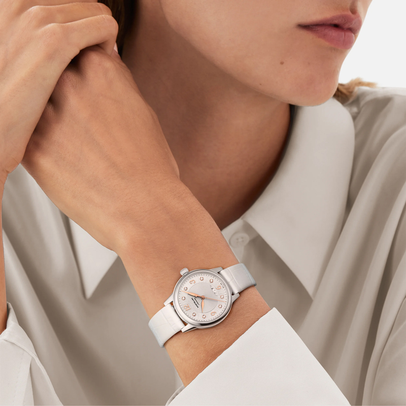 Ideal para mulheres que apreciam um toque clássico e intemporal, este modelo combina um mostrador madrepérola com detalhes requintados e numerais árabes delicadamente desenhados.