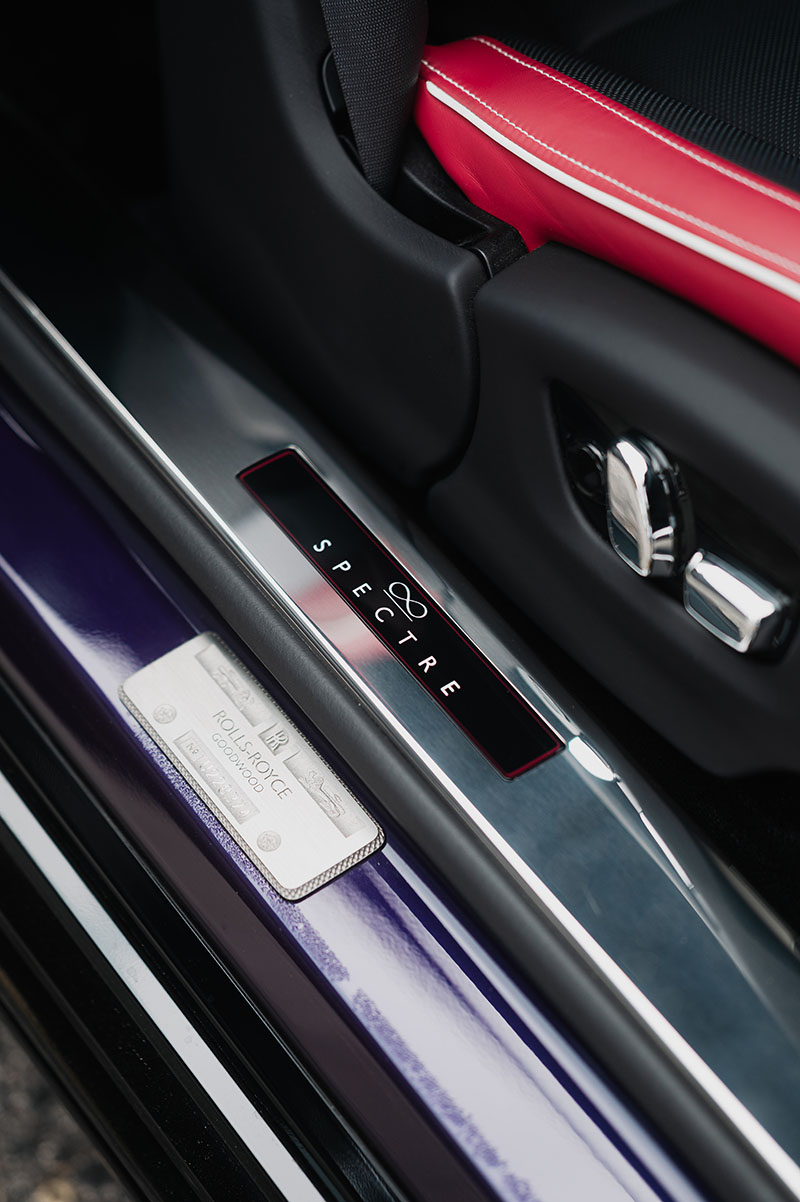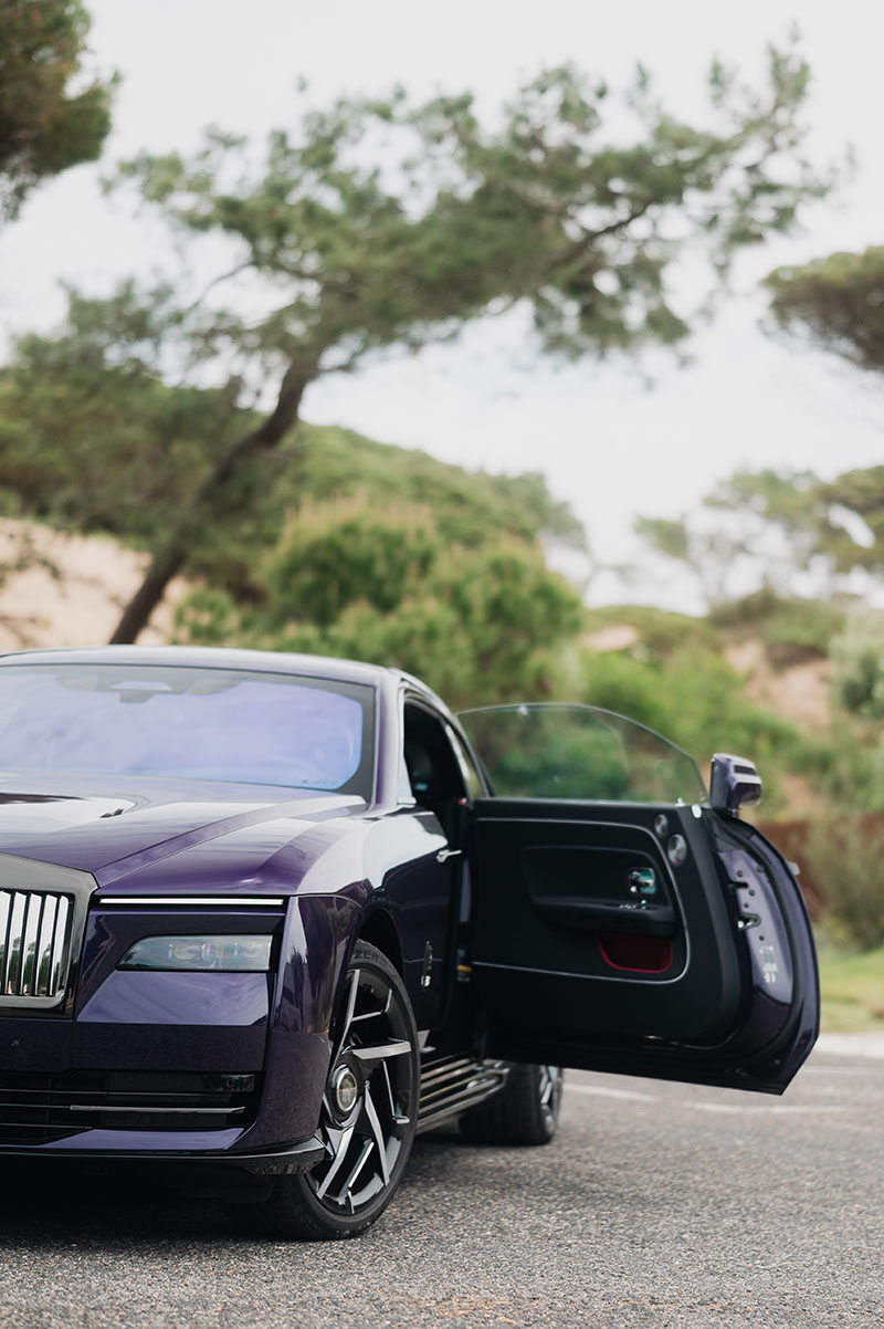 À tarde, a mudança de registo foi total, mas sem perder o ADN. O Black Badge Spectre, primeiro modelo totalmente eléctrico da marca, apresenta-se como um coupé superlativo com linhas fluidas e presença escultórica. A versão ensaiada em Vapour Violet, com interior preto e detalhes Peony Pink, é uma afirmação estética e tecnológica.