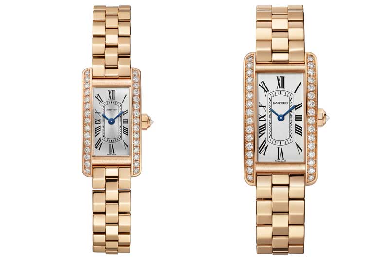 The most visible changes compared to their predecessors reside in thickness, as the new models are thinner: 8.6 mm thick compared to 9.5 mm in the previous generation. The new Tank Américaine is available in numerous options, including gold or steel cases with a leather strap; rose gold and diamonds with a leather bracelet or white and rose gold with diamond pavé and a metal bracelet specially designed for the Tank Américaine, with links that feature polished facets.