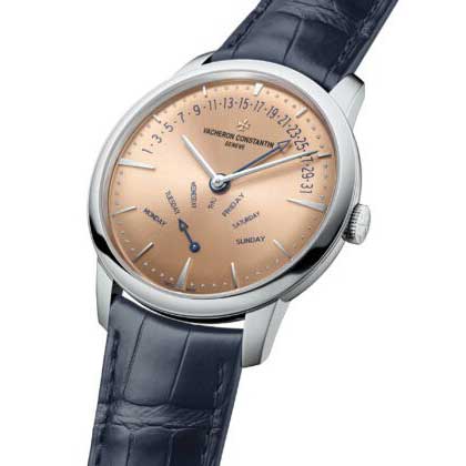 Apresentando um design minimalista inspirado em exibições retrógradas nos anos 20 e 30, o Patrimony Dia-Data Retrógrados é uma amostra de equilíbrio entre a elegância relojoeira tradicional e a simplicidade moderna. Disponível numa caixa de 42,5 mm em platina 950, o modelo exibe um mostrador em tons de salmão e padrão raio-de-sol com indicações de data, dia e hora.