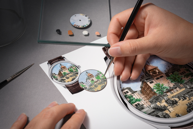 - Um mostrador que funde guilloché figurativo e esmalte pintado