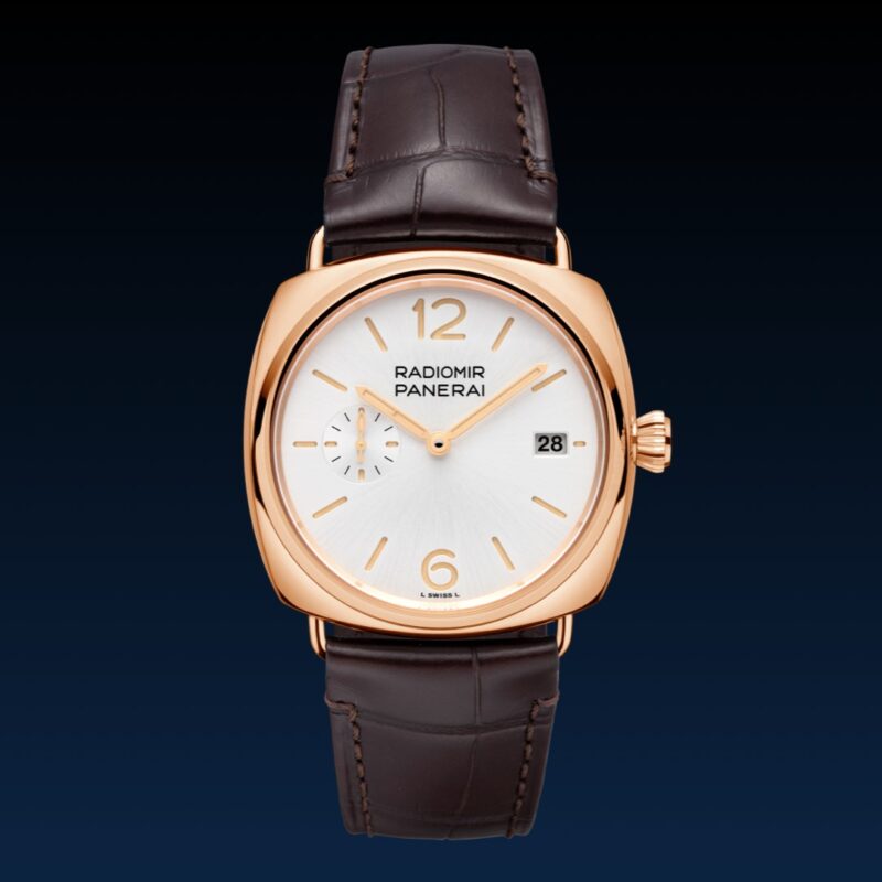 A contemporânea interpretação do Radiomir, o Radiomir Quaranta, surge agora no material Panerai Goldtech™. Assim, o Radiomir Quaranta Goldtech™ é apresentado numa caixa Goldtech™ polida, combinada com um mostrador branco escovado e uma correia em pele de crocodilo castanho mate.