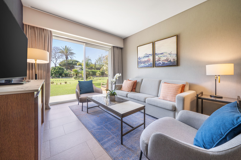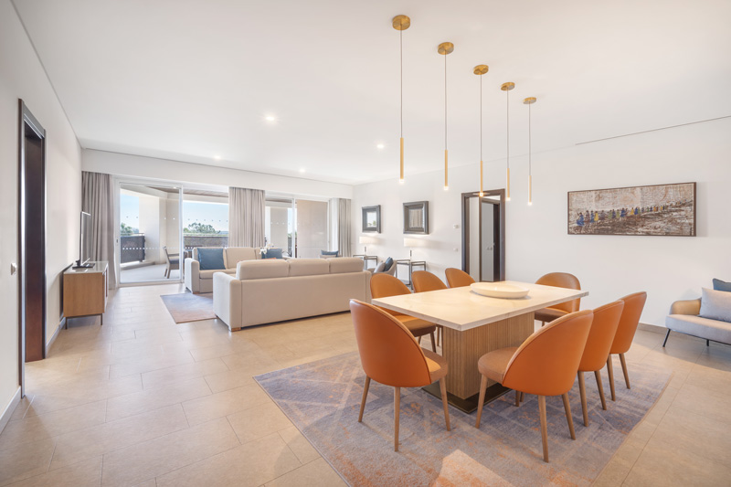 O átrio central, com ares de sala de estar de um palácio contemporâneo, é o coração pulsante do Wyndham. É a partir dele que se desdobram as alas Sunrise e Sunset, onde encontramos 132 suites generosas em dimensão e conceito, com varandas abertas à luz ou relvados que quase convidam ao descalçar. O conforto é uma constante: sofás e camas que desafiam a vontade de sair, kitchenettes discretas e o silêncio ideal para o repouso pleno.