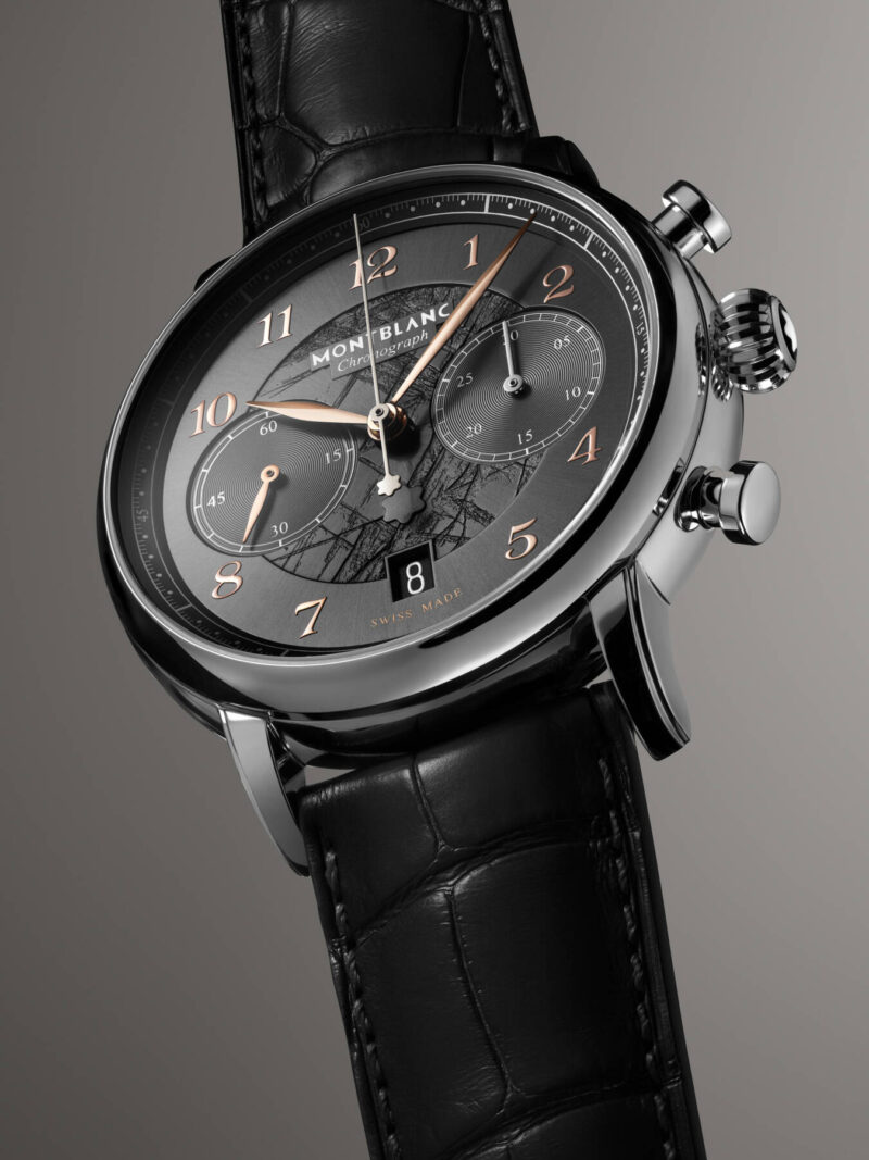 O Montblanc Star Legacy cronógrafo surge numa caixa de 42 mm em aço, com mostrador cinzento com padrão glaciar. Este relógio exibe dois contadores de cronógrafo com ponteiros bastão revestidos a ródio às três e às nove horas, enquanto as funções de tempo são exibidas com ponteiros em forma de folha revestidos a ouro rosa.