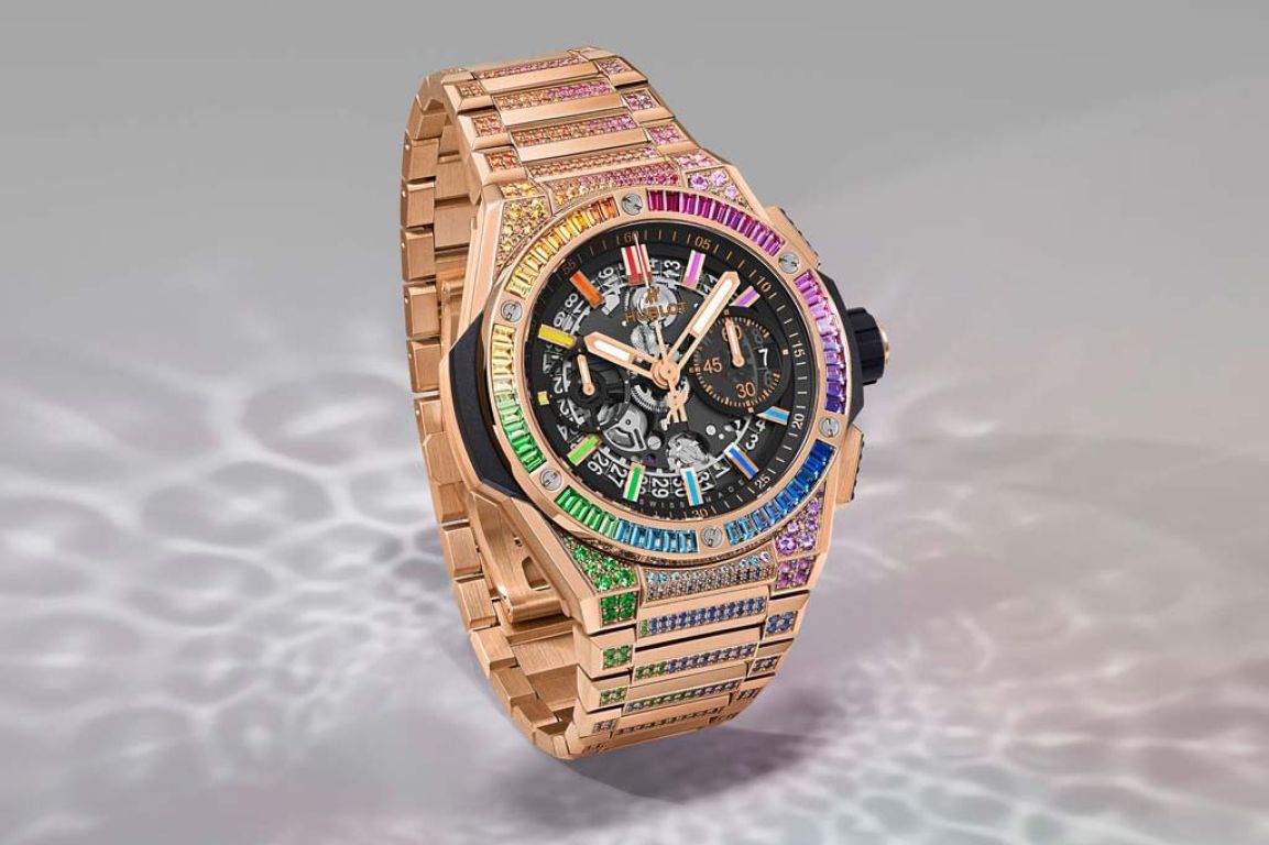 O Hublot Big Bang Integrated surge agora em duas novas versões em King Gold (a liga de ouro proprietária da marca) com um verdadeiro arco-íris de pedras preciosas na caixa e na pulseira. Entre as gemas coloridas em destaque estão rubis, ametistas, topázios azuis, tsavoritas, assim como safiras rosas, laranjas, azuis e amarelas.