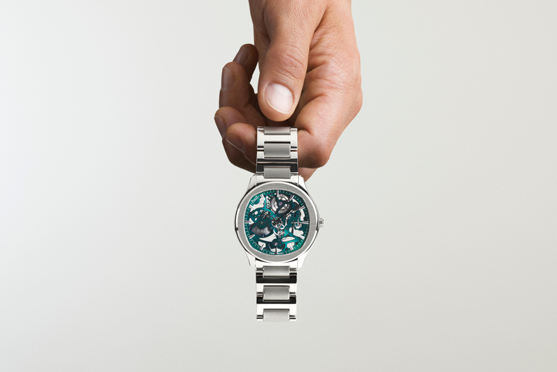 A nova versão do Piaget Polo Skeleton é entregue com uma pulseira em aço polido/escovado e uma pulseira em pele de crocodilo verde, ambas intercambiáveis.