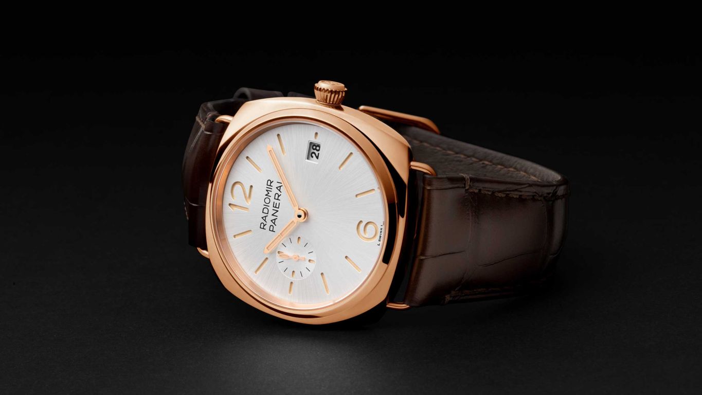 O Panerai Radiomir Quaranta Goldtech™ é apresentado numa caixa em Goldtech™ - um material de ouro vermelho proprietário da marca, que alia uma elevada percentagem de cobre a platina, resultando num tom intenso e num grau extremo de resistência mecânica e contra a oxidação -, combinada com um mostrador branco escovado e uma correia em pele de crocodilo castanho mate.