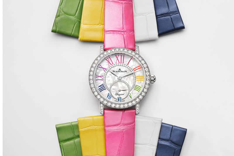 A colecção Ladybird Colors da Blancpain apresenta modelos que se destacam pela cor, pelo brilho dos diamantes e pelas indicações de pequenos segundos ou fases da Lua, elegantemente integradas na posição das 6h. As caixas de 34,9 mm em ouro vermelho ou branco recebem 58 diamantes individualmente ajustados à mão para garantir o brilho ideal.