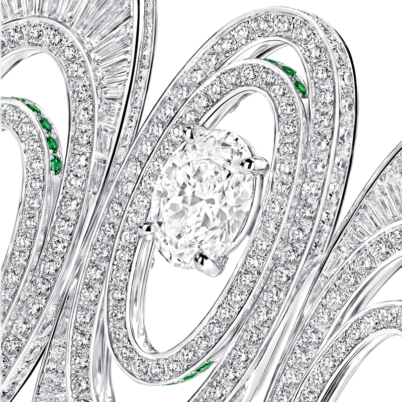 Mas a verdadeira surpresa esconde-se nos detalhes: discretamente embutida nas montagens em ouro branco, uma linha de esmeraldas pavé revela-se apenas ao olhar atento. Um toque secreto de verde Graff, que funciona como assinatura cromática e elemento de contraste visual. Esta subtileza cromática, quase sussurrada, acrescenta profundidade emocional e uma camada extra de sofisticação a cada peça.