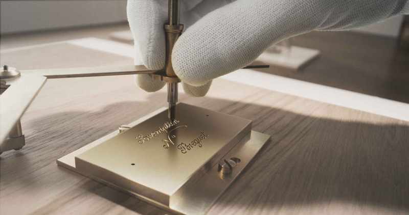 O movimento é decorado com acabamento "shot-blasted" nas pontes e na platina, realçado por parafusos em aço azul e rubis. No centro, o majestoso tambor de corda ostenta uma gravação especial: uma inscrição fiel à caligrafia original de Abraham-Louis Breguet, retirada dos seus folhetos históricos de vendas, reforçando a ligação entre passado e presente.