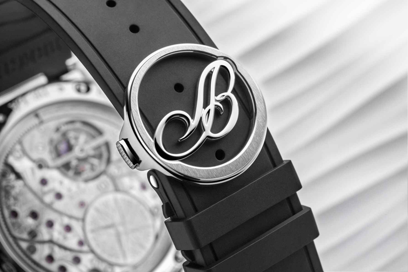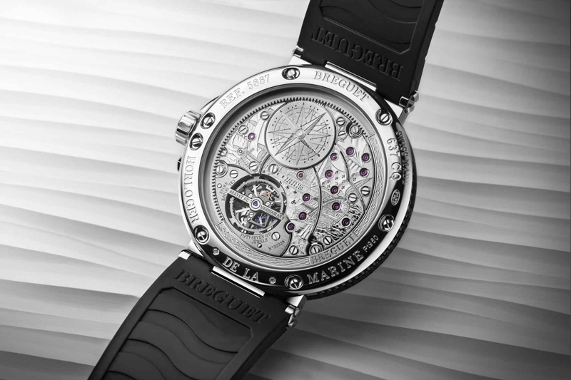 No verso, o fundo em vidro de safira revela gravações de elevada complexidade, como a silhueta do navio de guerra Royal Louis e uma rosa-dos-ventos esculpida sobre o tambor de corda, símbolos de navegação que reforçam o elo histórico da Breguet com o universo marítimo.