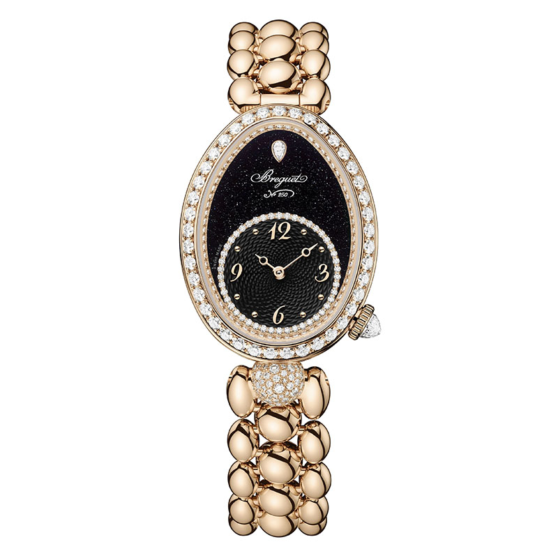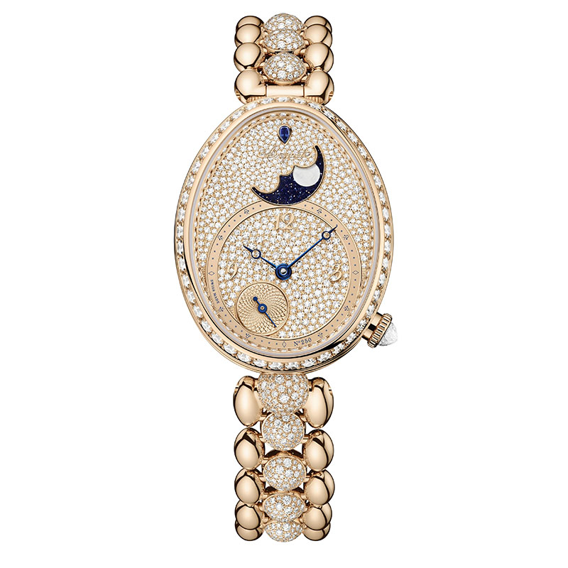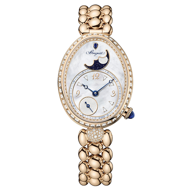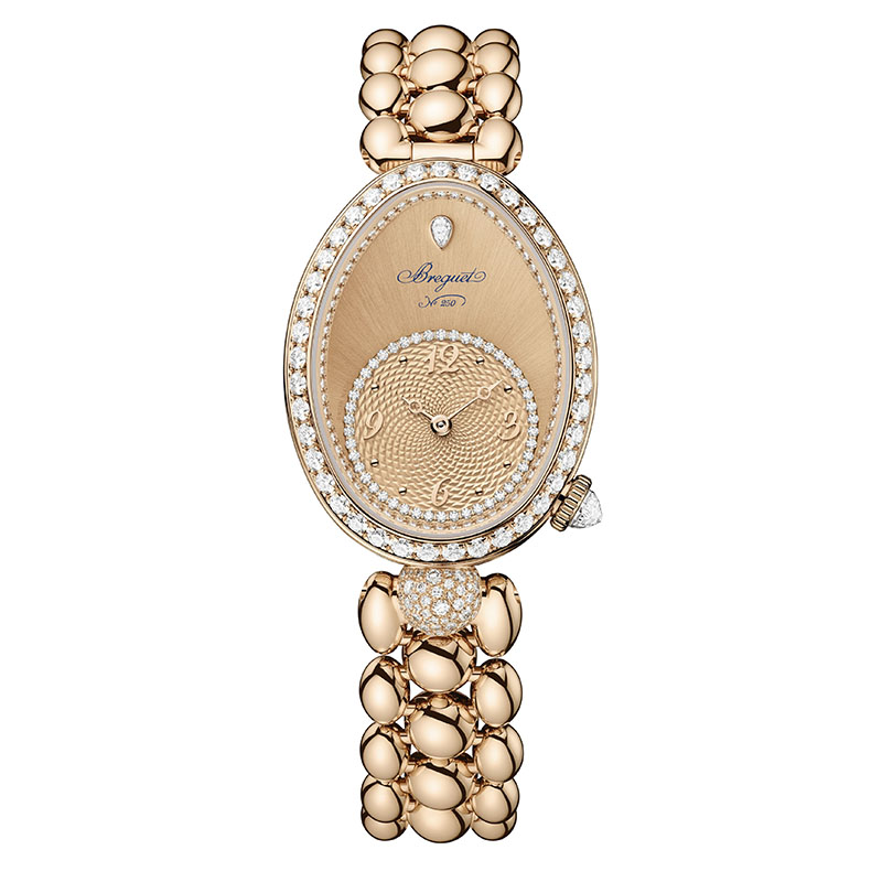 Reine de Naples 9935: 36,5 x 28,45 mm, ouro Breguet, 109 diamantes na luneta e flange, 52 no elo central, diamante briolette na coroa, estanque até 30 m.