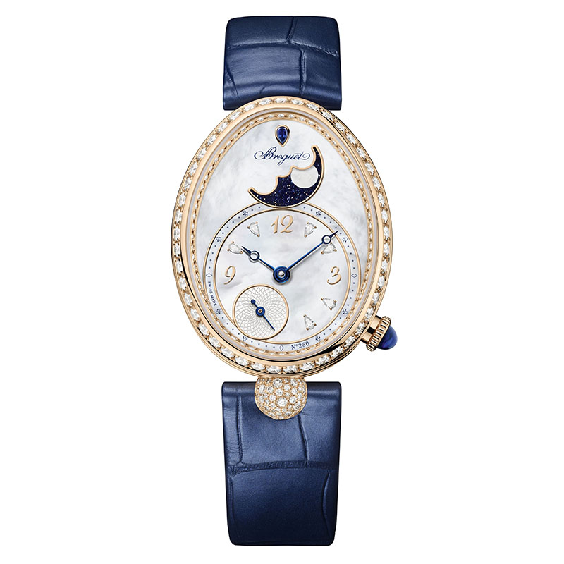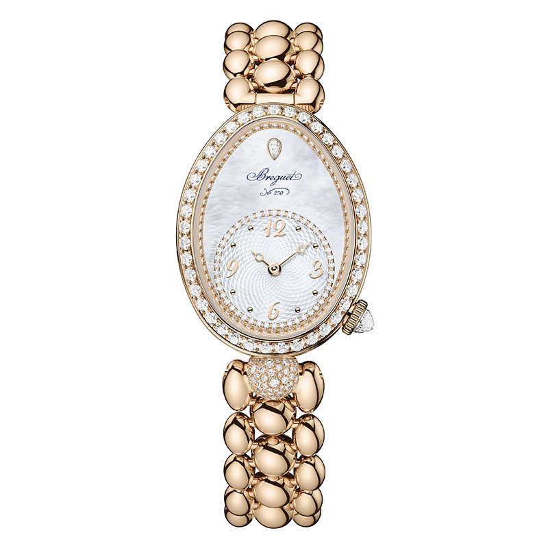 Reine de Naples 8925: 33 x 25 mm, ouro Breguet 18K, 107 diamantes na luneta, 52 no elo central, diamante briolette na coroa, estanque até 30 m.