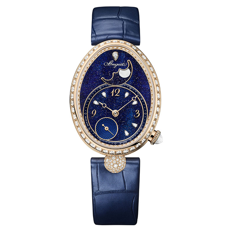 A referência 9935 introduz um novo movimento — o calibre automático 537L2 — e um mostrador redesenhado, com uma leitura mais pura das horas, minutos, pequenos segundos e fases da lua. Pela primeira vez, a linha Reine de Naples apresenta uma indicação lunar ampliada, libertando-se do indicador de reserva de marcha para dar protagonismo à poesia do céu nocturno. A lua, em madrepérola branca, surge sobre um céu de aventurina azul e oculta a nova assinatura secreta da Breguet, visível apenas sob um determinado ângulo.