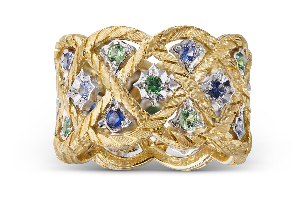 Lançada nos anos 1990, a colecção Étoilée celebra o savoir-faire da Buccellati através de refinados conjuntos de correntes entrelaçadas em ouro, que criam elegantes espaços romboidais. Dentro de cada padrão, flores de lírio em miniatura desabrocham, engastadas com diamantes.