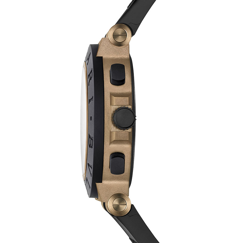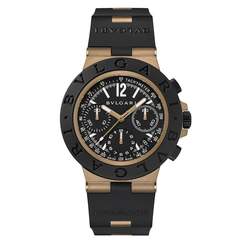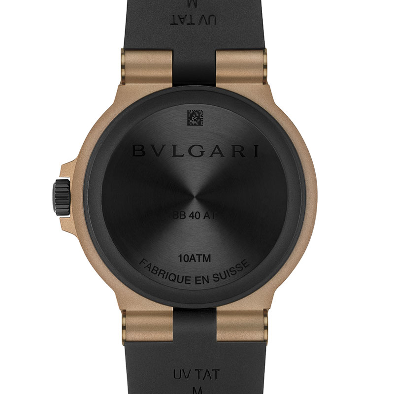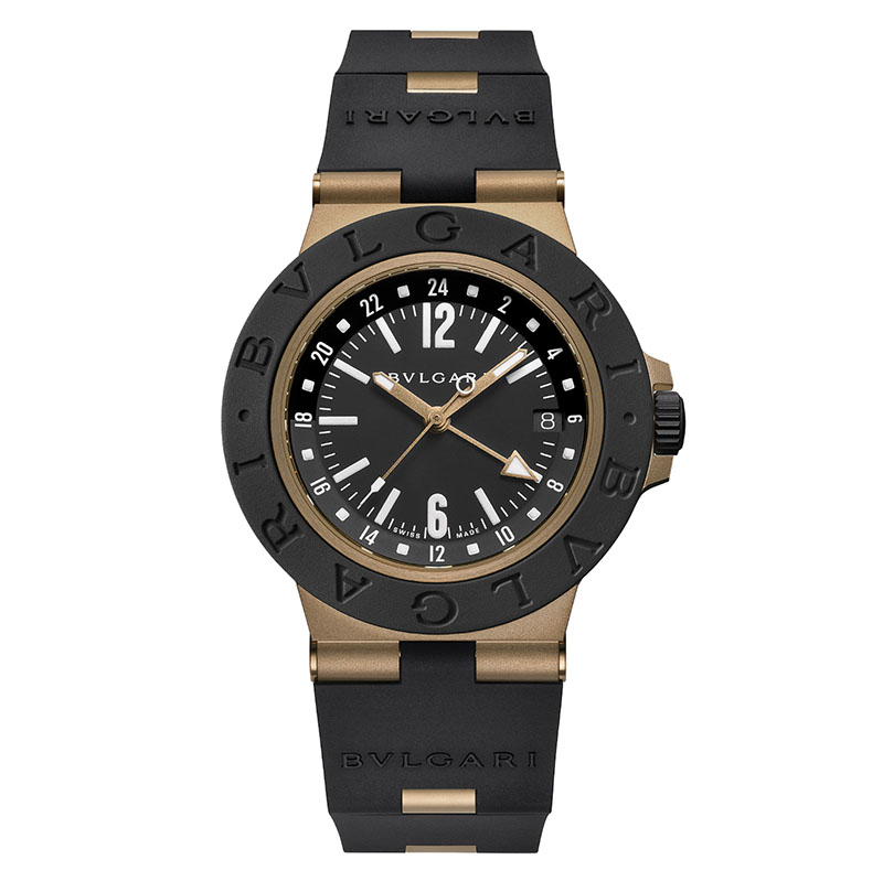 Dois modelos revelam este novo capítulo: Bvlgari Bronzo GMT, dedicado aos viajantes, e Bvlgari Bronzo Chronograph, pensado para os amantes da precisão. Ambos destacam-se pela presença magnética do bronze, que contrasta com o preto profundo do cauchu, criando uma linguagem estética forte e sofisticada.