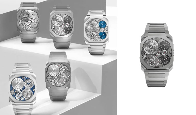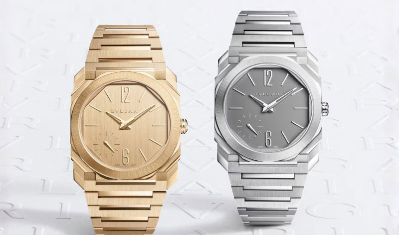 A gama de lançamento divide-se em quatro versões. O titânio jateado com mostrador opalino e ponteiros negros é a referência de base, o elo de continuidade com as origens da coleção. O titânio satinado e polido, com acabamento feito inteiramente à mão, apresenta uma qualidade de luz diferente, mais próxima do aço mas com a leveza característica do titânio. O ouro amarelo de 18 quilates, com mostrador e ponteiros a condizer, reafirma a vocação joalheira da Maison e responde à procura de quem viu sempre no Finissimo um objeto simultaneamente relojoeiro e precioso. A quarta versão é o Octo Finissimo 37 Minute Repeater em titânio jateado, de 6,85 mm de espessura, equipado com o calibre manual BVL 362 de dois martelos e 42 horas de reserva de marcha. Não reclama nenhum recorde. Não precisa: a complicação fala por si, e a acústica do titânio, escolhido também pelas suas propriedades sonoras, faz com que o mecanismo se ouça mesmo num ambiente ruidoso.