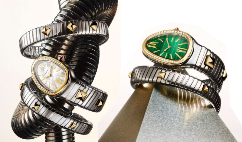 A Bvlgari regressa também ao diálogo entre ouro e aço que marcou a sua identidade criativa nos anos setenta. A cápsula Serpenti Tubogas Studs introduz o "clou" piramidal, elemento retirado dos arquivos de joalharia da Maison, na bracelete Tubogas, pontuando as espirais sensuais do metal com uma geometria angular que transforma o conjunto numa escultura que envolve o pulso. As quatro edições limitadas exploram combinações de ouro amarelo, ouro rosa e aço com mostradores em cornalina, sodalite, malaquite e madrepérola, cada qual com a sua personalidade cromática e mineral. Um movimento de quartzo assegura a precisão no interior de uma caixa de 35 mm, e cada versão inclui uma coroa cravejada com rubelite cortada em cabochão.