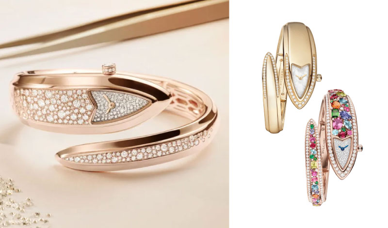 A metamorfose da serpente continua com o Serpenti Aeterna, agora em duas versões. A peça de alta joalharia em ouro rosa está inteiramente pavimentada com 122 pedras de cor raras, entre rubelites, ametistas, esmeraldas e turmalinas Paraíba, orquestradas em 225 horas de desenvolvimento e mais de 60 horas de cravação. Diamantes brancos percorrem o contorno da serpente, capturando a energia cromática do conjunto. A segunda versão, em ouro amarelo com mostrador em madrepérola branca e apenas alguns acentos de diamantes, propõe uma leitura mais quotidiana da mesma silhueta, uma joia de uso diário que não abdica de ser extraordinária.