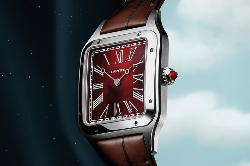 A primeira é o elegante relógio Santos-Dumont Rewind, que desafia os métodos tradicionais de contagem do tempo. A edição limitada em platina apresenta um mostrador em cornalina com números romanos arrojados dispostos em sentido inverso, refletindo a audácia de Santos-Dumont. O seu movimento mecânico com corda manual invertida faz recuar os ponteiros em forma de maçã, oferecendo um toque único na cronometragem.