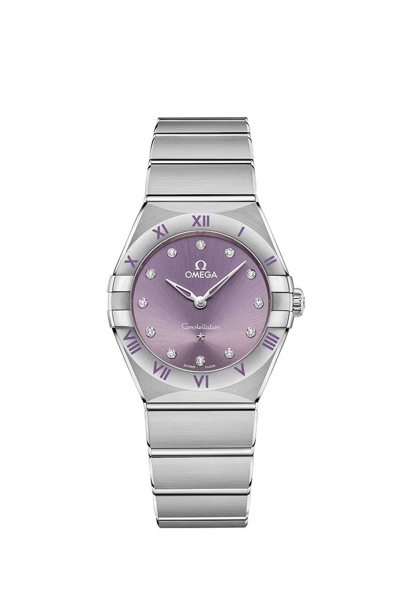 Para pulsos femininos, os modelos de 28 mm e 29 mm da linha Constellation da Omega vestem-se este ano de muita cor. Movidos a quartzo, os relógios de 28 mm apresentam-se agora em cores pastel, combinadas com diamantes. Os mostradores rosa e azul exibem marcadores clássicos, enquanto os modelos verde e roxo surgem com diamantes aplicados.