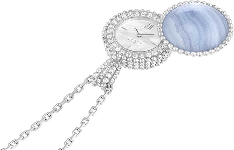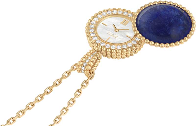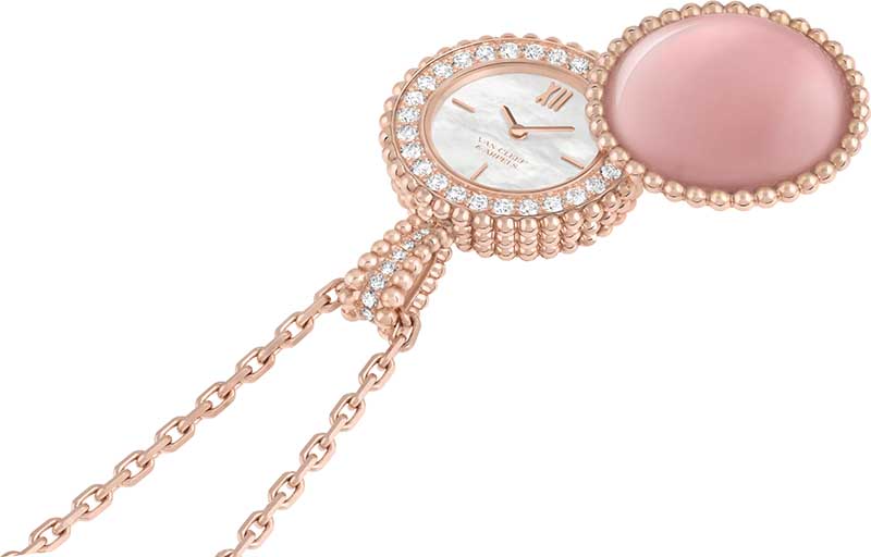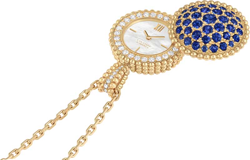 A colecção Perlée da Van Cleef & Arpels recebe seis relógios sautoir secretos, onde as contas douradas se aliam à cor das pedras preciosas ou ornamentais. Inspiradas nos relógios de bolso que surgiram na Europa no século XVII, estas criações assumem a forma de pendentes curvos e coloridos. Verdadeiras peças de joalharia, usam-se num colar longo e, para verificar a hora discretamente, basta girar o motivo engastado para revelar o mostrador.