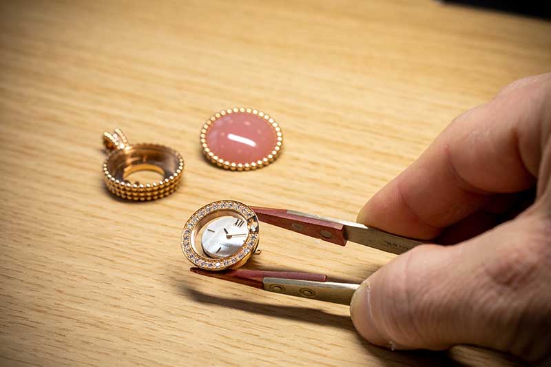 Três destes relógios preciosos acentuam o brilho das contas com os tons intensos das pedras preciosas coloridas. Os rubis respondem às delicadas nuances do ouro rosa, enquanto as safiras e esmeraldas se harmonizam com o brilho do ouro amarelo. Por outro lado, três materiais raros no mundo da joalharia fazem a sua entrada na colecção Perlée, em forma de cabochões. A calcedónia, com os seus tons de cinzento azulado a azul claro, oferece uma translucidez delicada em faixas estriadas regulares e é realçada pelo brilho do ouro branco, enquanto o quartzo rosa – utilizado pela primeira vez na colecção – é conhecido pela cor pastel, aqui combinada com o ouro rosa. Finalmente, a sodalita, com o seu azul translúcido tingido de violeta, alia-se ao ouro amarelo.