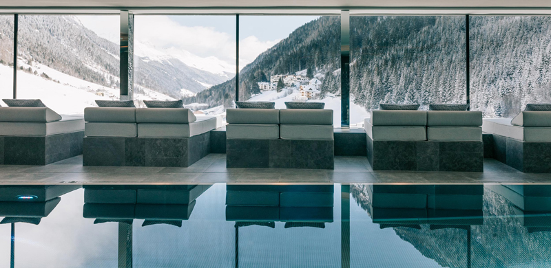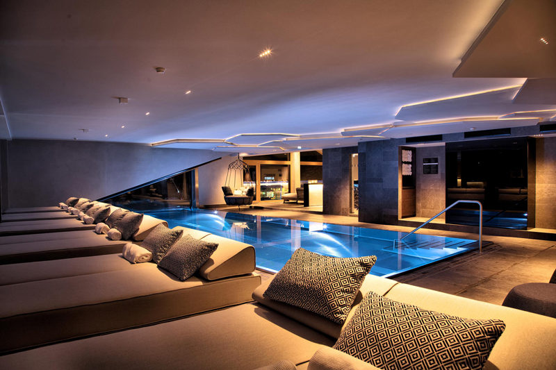 A experiência de luxo no Elizabeth Arthotel não se limita à arte ou às pistas de ski. O spa no último piso, com uma piscina infinita de tirar o fôlego, convida à serenidade absoluta. A vista para as montanhas cobertas de neve, combinada com saunas finlandesas e orgânicas, transforma cada momento num verdadeiro ritual de bem-estar.