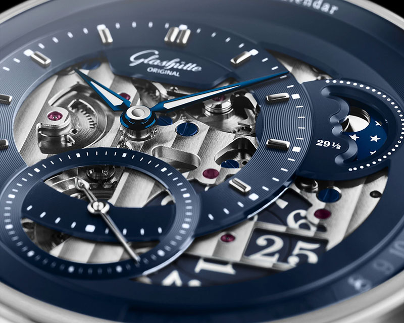 Azul esqueletizado, índices aplicados em ouro branco, horas e minutos descentrados, pequenos segundos, grande data Panorama, mês retrógrado em vidro de safira, fases da lua