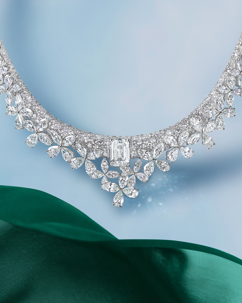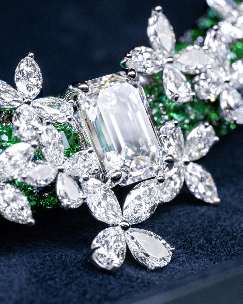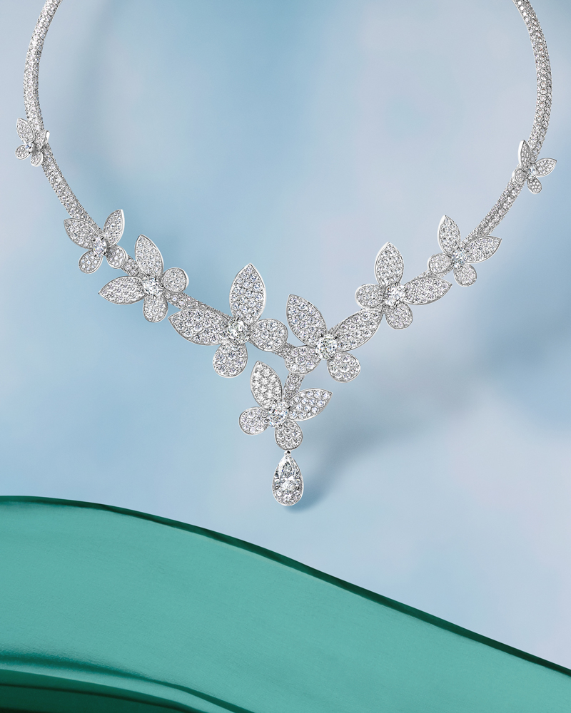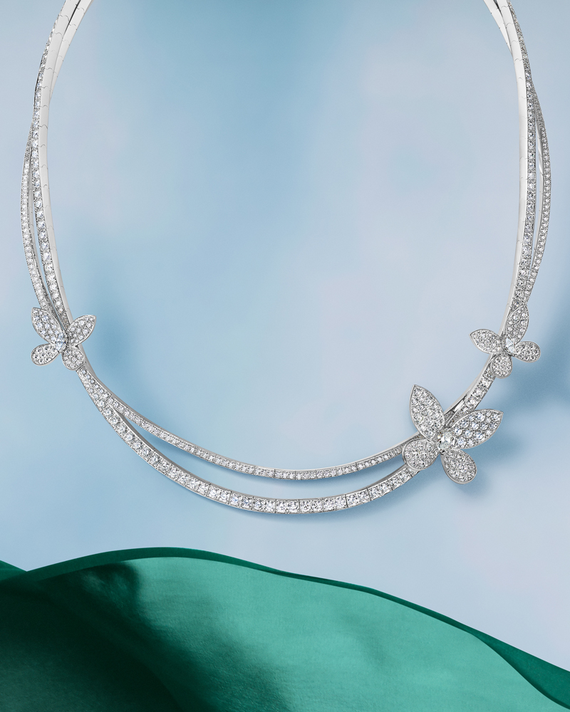 Outro destaque é o colar de diamantes em graduação, onde um fio delicado de borboletas em diamantes, dispostas em tamanhos graduais, realça a sofisticação do design. No centro, um diamante esmeralda de 5,02 quilates serve de ponto focal, com borboletas a flutuar elegantemente em cascata.